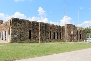 Oklahoma’s WPA armories are immediately recognizable by their style. Architect and National Guard Major Bryan Nolen used standard plans for one, two, and four-unit armories. These Art Deco armories were designed to look like military castle battlements using parapets and arched entryways. Inside each armory was a huge central drill hall, a subterranean rifle range, garages, and administrative offices. Following the WPA’s practical make-work philosophy, construction was accomplished by unskilled workers, and consequently, craftsmanship depended on the supervisors’ and laborers’ skill and experience level. The Hominy Armory was built as a one-unit armory and was officially opened for business in 1938.