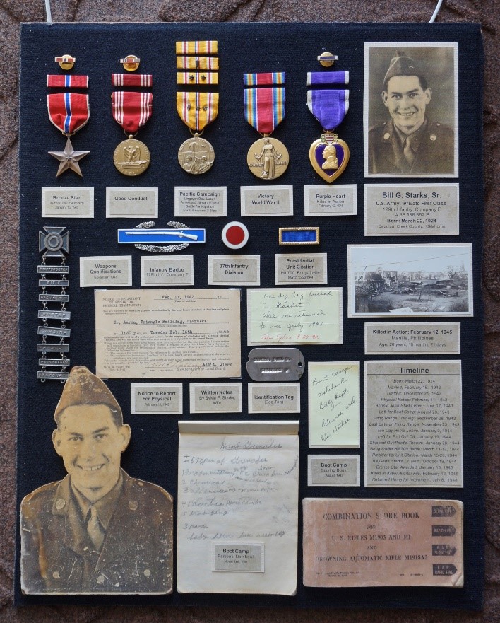 During his service, Starks qualified for seven different weapons and received two battle stars, one beachhead arrowhead, Good Conduct medal, WWII Victory medal, Pacific Campaign medal, Presidential Unit Citation, Bronze Star and Purple Heart.