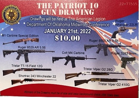 The 10-gun raffle drawing will be held during this mid-winter conference in Shawnee, OK in January 2022. If you want a chance to win one of the ten guns, track down any of the Post 142 members in Hominy. Each ticket is only $10.00.
