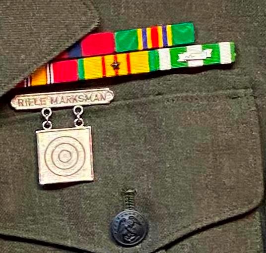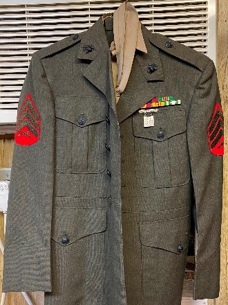 A couple of weeks ago I stopped by the Hut to check on something and I found, hanging on the Hut doorknob, a U.S. Marine Uniform that includes a Jacket, Shirt, Tie, insignias, and Medals. I asked all the Guys at the Hut and none of them had any idea where the uniform came from. All the Legionnaire said I should put it in the paper and maybe whoever left it at the Hut will come forward and let us know who the uniform belonged to. According to the stripes on the jacket sleeve the Marine was a Sergeant and the ribbons on the front of the jacket are the Bronze Star, Navy Meritorious Unit Commendation Ribbon, National Defense Ribbon, Vietnam Service Ribbon, and the Vietnam Campaign Ribbon. A picture of the uniform is posted bellow.